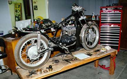 The bike is completely disassembled here. Parts is parts as they say, now what to do... Good organization and notes are key to the success of getting an old bike taken apart and put back together CORRECTLY once everything has been restored