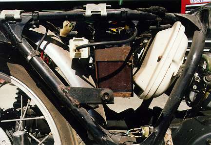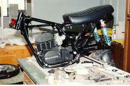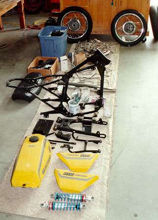 Assembly begins! Lynn Mobley (president of SMOG) did an outstanding job rebuilding the motor and carb. The frame/swingarm etc are powdercoated. The seat has new foam and a new cover was made after refinishing the fiberglass base. New WORKS shocks have been fitted....