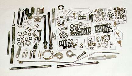 Some of the old nuts and bolts before sending off to get cad-plated. I laid everything out, photographed and noted where each and every nut, bolt, washer, spacer etc came from to help out with the reassembly.